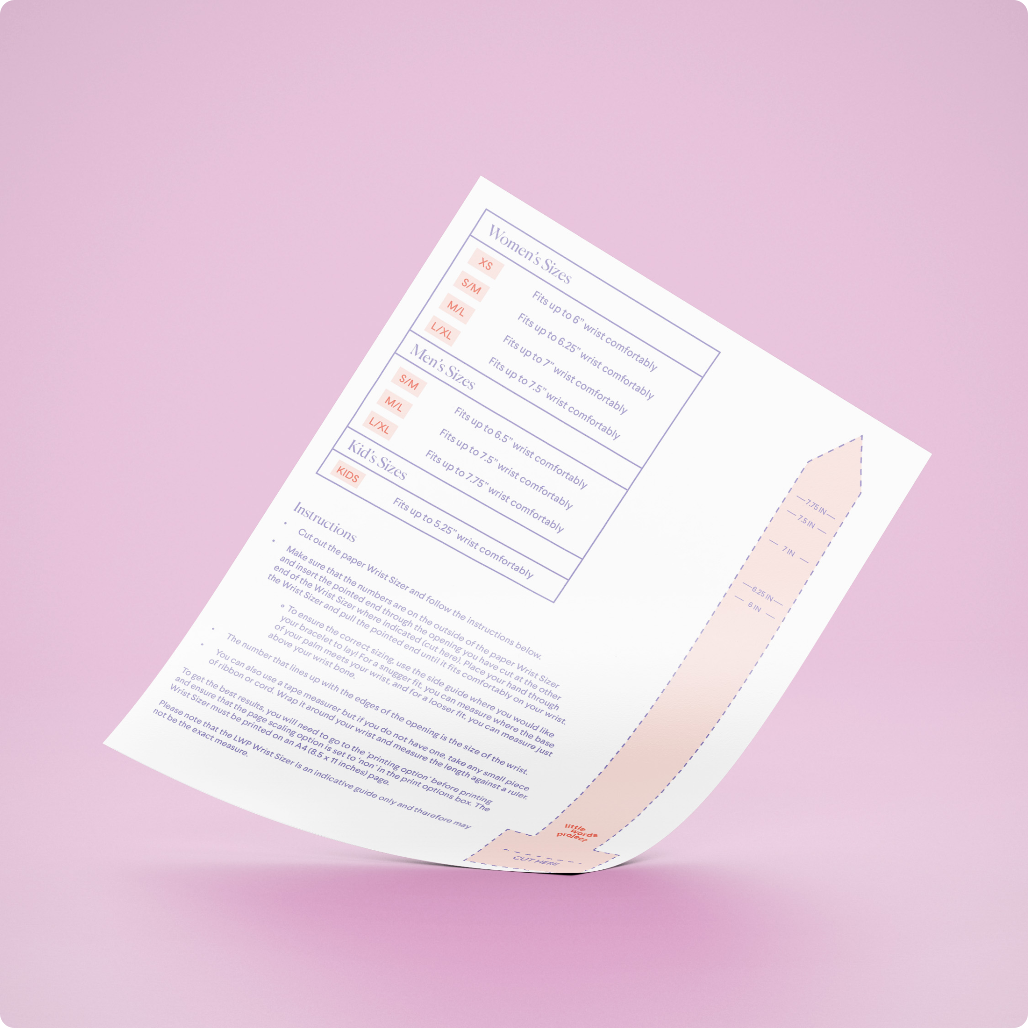 To get the best results, you will need to go to the 'printing option' before printing and ensure that the 'page scaling' option is set to 'none' in the print options box. The Wrist Sizer must be printed on an A4 (8 1/2 x 11 inches) size page.